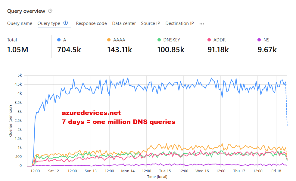 The domain azuredevices.net is not owned or managed by Microsoft. The first 7 days received over 1 million DNS queries.